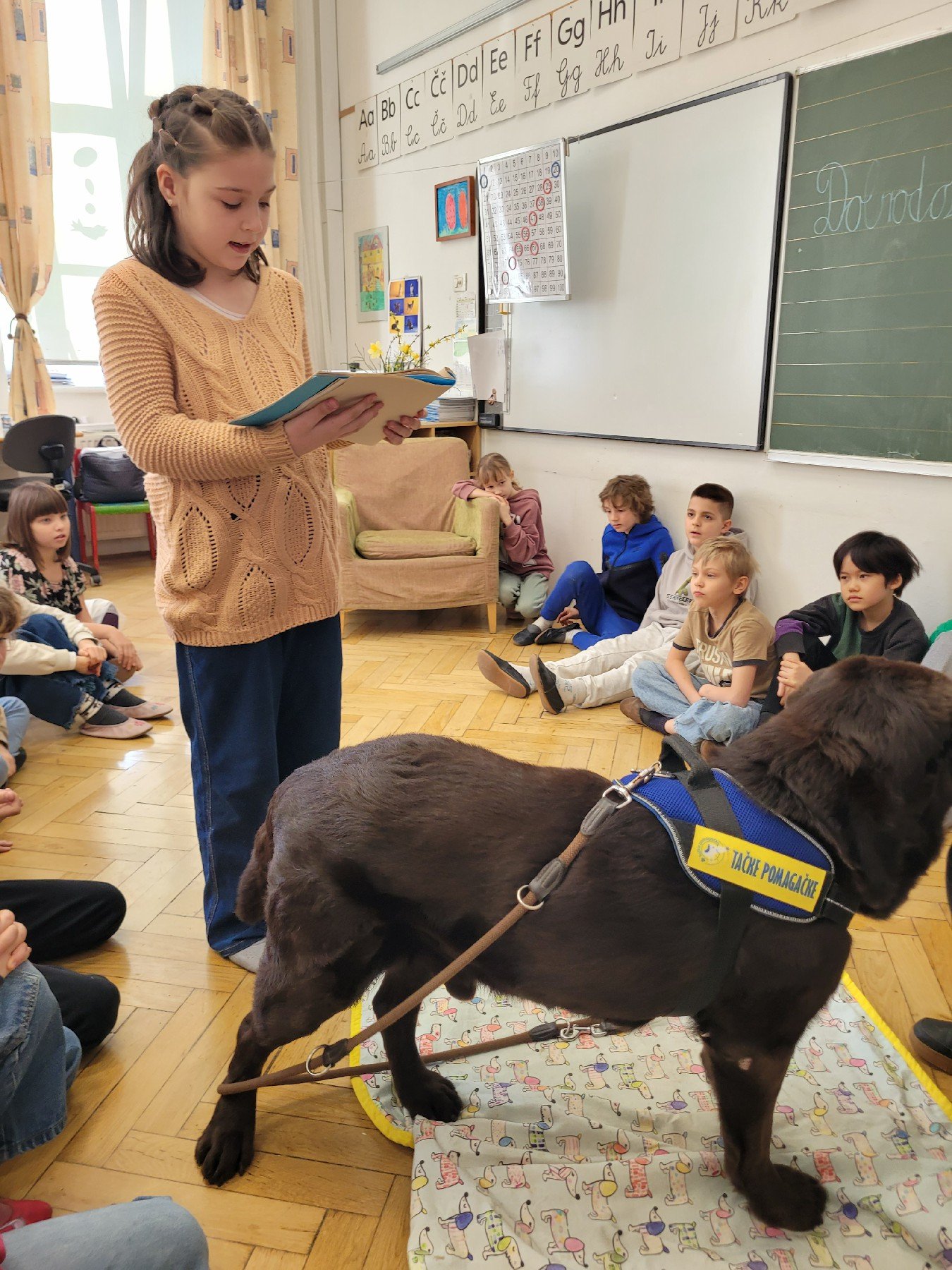 V 3. a je bilo v ponedeljek, 16. 3. 2026, še posebej živahno in navdihujoče, saj je učence ponovno obiskal prav poseben gost – bralni kuža Thor s svojo vodnico Dušanko. Njuni obiski prinašajo toplino, veselje in dodatno motivacijo za branje, saj učenci ob Thorovi mirni in prijazni prisotnosti z večjim veseljem posegajo po knjigah.