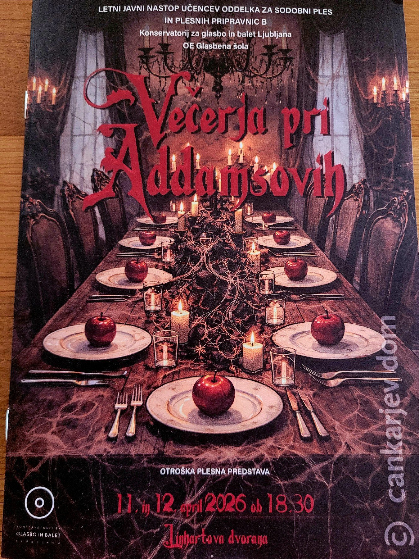Učenci Jona Jerončič iz 3. a, Valentin Mahnič iz 5. b in Sofija Brec iz 8. b so 11. in 12. aprila 2026 nastopili v plesni predstavi Večerja pri Addamsovih.